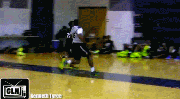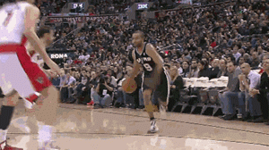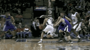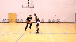 转身上篮的第一步是变向,并不是很低很快的crossover,只要直接把球运向左侧就好,为了把防守者的重心吸引到这一侧,所以动作当然是越明显越好,不过不要把球运得太远,尽量贴近自己,避免被抢断,同时也便于收球。